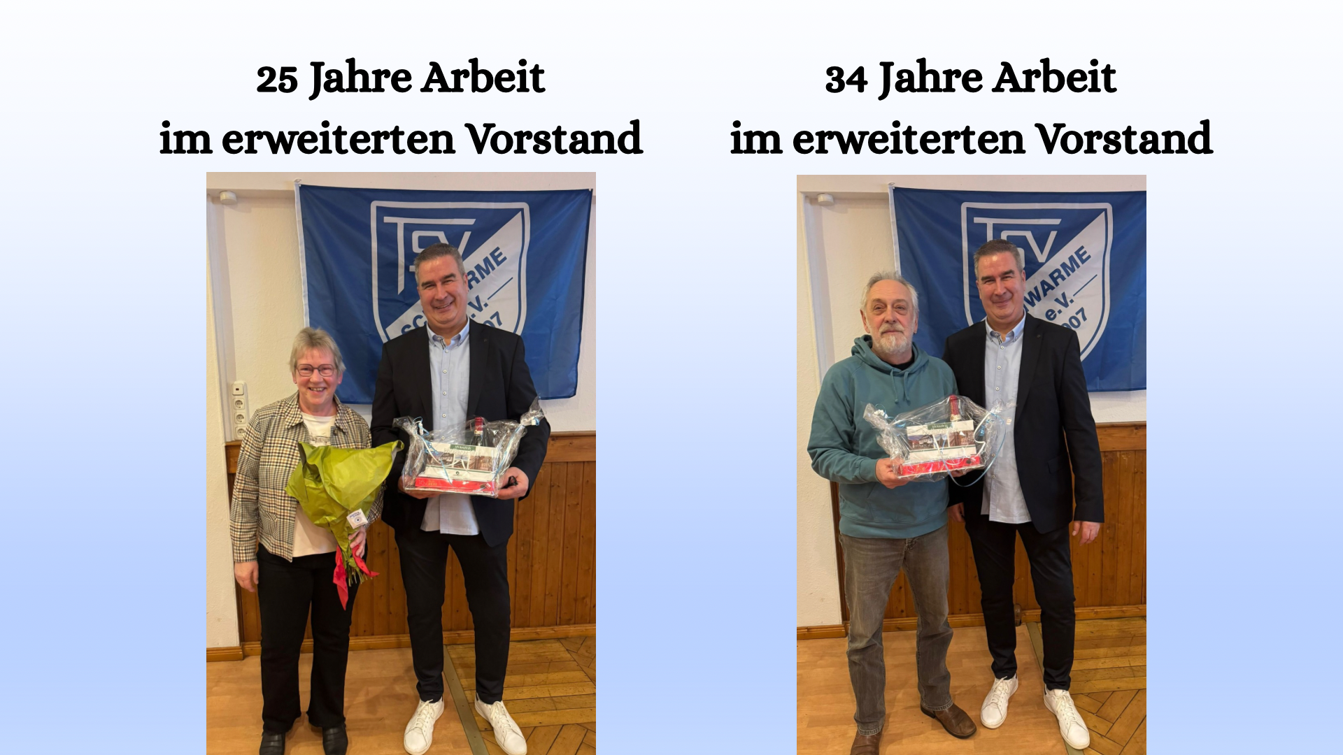 Rainer Asendorf (20 Jahre Sozialwart), Kerstin zum Hingst (25 Jahre Spartenleiterin), Ralf Poyda (34 Jahre Spartenleiter) sowie Oliver Hüneke für 15 Jahre Vorstandstätigkeit.